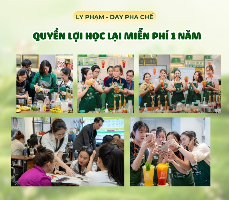 Học viên có thể đăng ký học lại bất cứ khi nào trong vòng 1 năm nếu muốn ôn lại kiến thức, luyện thêm tay nghề hoặc chưa sẵn sàng áp dụng vào thực tế pha chế hay kinh doanh.