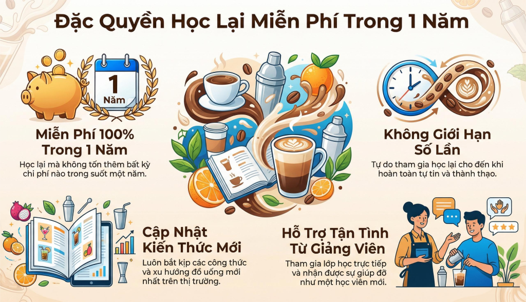 Trong thời gian 1 năm, học viên có thể quay lại lớp để học thêm công thức mới, đồ uống theo mùa và xu hướng thị trường, giúp việc áp dụng thực tế luôn phù hợp.